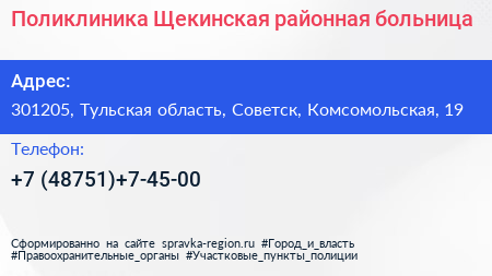 Поликлиника, Щекинская районная больница по адресу 301205, Тульская область, Советск, Комсомольская, 19 в дальнейшем Организация, размещена в следующих категориях: