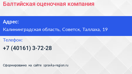 Балтийская оценочная компания по адресу Калининградская область, Советск, Таллаха, 19 в дальнейшем Организация, размещена в следующих категориях: