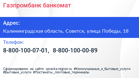 Газпромбанк, банкомат по адресу Калининградская область, Советск, улица Победы, 18 в дальнейшем Организация, размещена в следующих категориях: