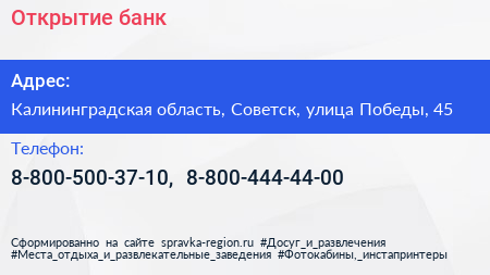 Открытие, банк по адресу Калининградская область, Советск, улица Победы, 45 в дальнейшем Организация, размещена в следующих категориях: