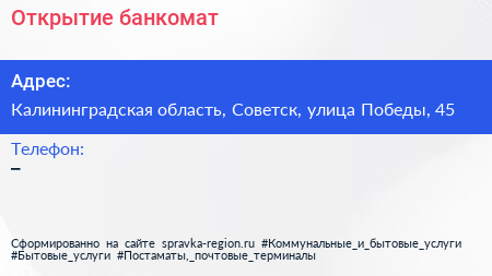 Открытие, банкомат по адресу Калининградская область, Советск, улица Победы, 45 в дальнейшем Организация, размещена в следующих категориях: