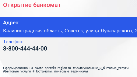 Открытие, банкомат по адресу Калининградская область, Советск, улица Луначарского, 2 в дальнейшем Организация, размещена в следующих категориях: