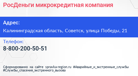 РосДеньги, микрокредитная компания по адресу Калининградская область, Советск, улица Победы, 21 в дальнейшем Организация, размещена в следующих категориях: