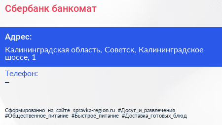 Сбербанк, банкомат по адресу Калининградская область, Советск, Калининградское шоссе, 1 в дальнейшем Организация, размещена в следующих категориях: