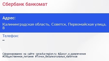 Сбербанк, банкомат по адресу Калининградская область, Советск, Первомайская улица, 8 в дальнейшем Организация, размещена в следующих категориях: