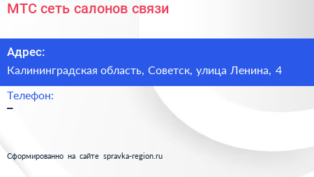 МТС, сеть салонов связи по адресу Калининградская область, Советск, улица Ленина, 4 в дальнейшем Организация, размещена в следующих категориях: