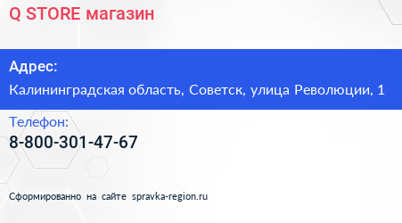 Q STORE, магазин по адресу Калининградская область, Советск, улица Революции, 1 в дальнейшем Организация, размещена в следующих категориях: