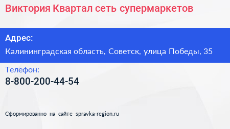 Виктория Квартал, сеть супермаркетов по адресу Калининградская область, Советск, улица Победы, 35 в дальнейшем Организация, размещена в следующих категориях: