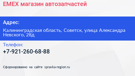 EMEX, магазин автозапчастей по адресу Калининградская область, Советск, улица Александра Невского, 28д в дальнейшем Организация, размещена в следующих категориях: