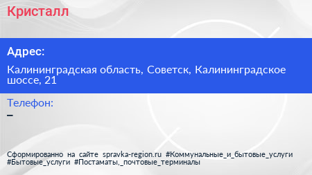 Кристалл по адресу Калининградская область, Советск, Калининградское шоссе, 21 в дальнейшем Организация, размещена в следующих категориях: