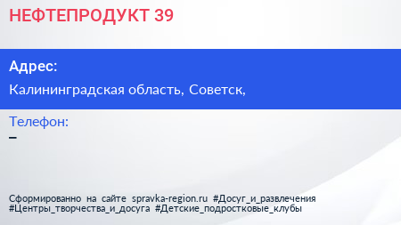 НЕФТЕПРОДУКТ 39 по адресу Калининградская область, Советск, в дальнейшем Организация, размещена в следующих категориях:
