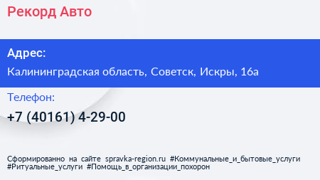 Рекорд-Авто по адресу Калининградская область, Советск, Искры, 16а в дальнейшем Организация, размещена в следующих категориях: