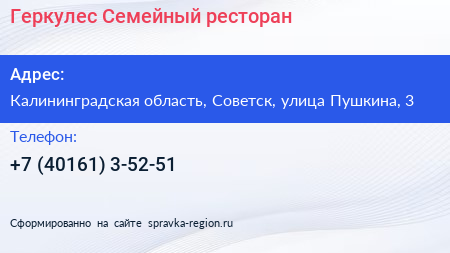 Геркулес, Семейный ресторан по адресу Калининградская область, Советск, улица Пушкина, 3 в дальнейшем Организация, размещена в следующих категориях: