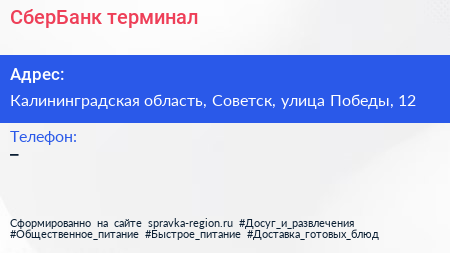 СберБанк, терминал по адресу Калининградская область, Советск, улица Победы, 12 в дальнейшем Организация, размещена в следующих категориях: