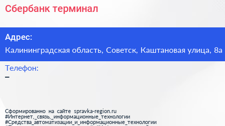 Сбербанк, терминал по адресу Калининградская область, Советск, Каштановая улица, 8а в дальнейшем Организация, размещена в следующих категориях:
