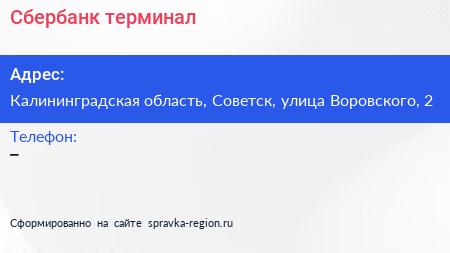 Сбербанк, терминал по адресу Калининградская область, Советск, улица Воровского, 2 в дальнейшем Организация, размещена в следующих категориях: