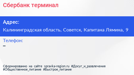 Сбербанк, терминал по адресу Калининградская область, Советск, Капитана Лямина, 9 в дальнейшем Организация, размещена в следующих категориях: