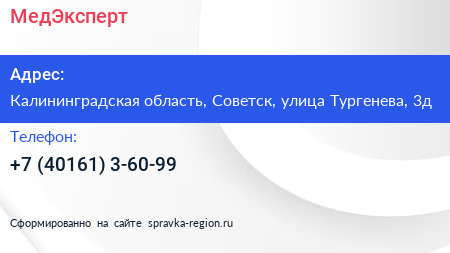 МедЭксперт по адресу Калининградская область, Советск, улица Тургенева, 3д в дальнейшем Организация, размещена в следующих категориях: