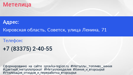 Метелица по адресу Кировская область, Советск, улица Ленина, 71 в дальнейшем Организация, размещена в следующих категориях: