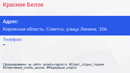 Красное & Белое по адресу Кировская область, Советск, улица Ленина, 106 в дальнейшем Организация, размещена в следующих категориях:
