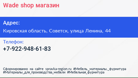 Wade shop, магазин по адресу Кировская область, Советск, улица Ленина, 44 в дальнейшем Организация, размещена в следующих категориях: