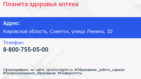Планета здоровья, аптека по адресу Кировская область, Советск, улица Ленина, 32 в дальнейшем Организация, размещена в следующих категориях: