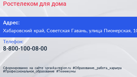 Ростелеком для дома по адресу Хабаровский край, Советская Гавань, улица Пионерская, 10 в дальнейшем Организация, размещена в следующих категориях: