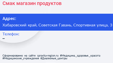 Смак, магазин продуктов по адресу Хабаровский край, Советская Гавань, Спортивная улица, 3 в дальнейшем Организация, размещена в следующих категориях: