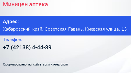 Миницен, аптека по адресу Хабаровский край, Советская Гавань, Киевская улица, 13 в дальнейшем Организация, размещена в следующих категориях: