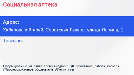Социальная аптека по адресу Хабаровский край, Советская Гавань, улица Ленина, 2 в дальнейшем Организация, размещена в следующих категориях:
