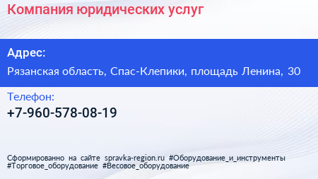 Компания юридических услуг по адресу Рязанская область, Спас-Клепики, площадь Ленина, 30 в дальнейшем Организация, размещена в следующих категориях: