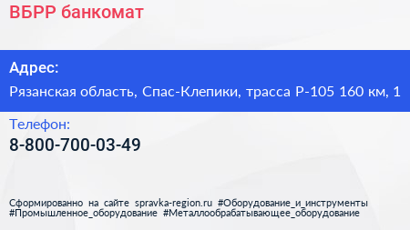 ВБРР, банкомат по адресу Рязанская область, Спас-Клепики, трасса P-105 160 км, 1 в дальнейшем Организация, размещена в следующих категориях:
