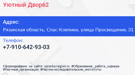 Уютный Двор62 по адресу Рязанская область, Спас-Клепики, улица Просвещения, 31 в дальнейшем Организация, размещена в следующих категориях: