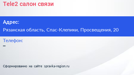 Tele2, салон связи по адресу Рязанская область, Спас-Клепики, Просвещения, 20 в дальнейшем Организация, размещена в следующих категориях: