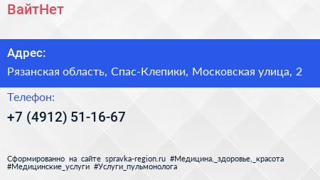 ВайтНет по адресу Рязанская область, Спас-Клепики, Московская улица, 2 в дальнейшем Организация, размещена в следующих категориях: