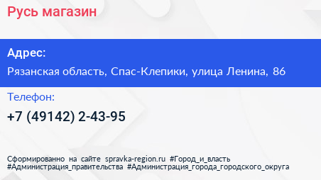 Русь, магазин по адресу Рязанская область, Спас-Клепики, улица Ленина, 86 в дальнейшем Организация, размещена в следующих категориях: