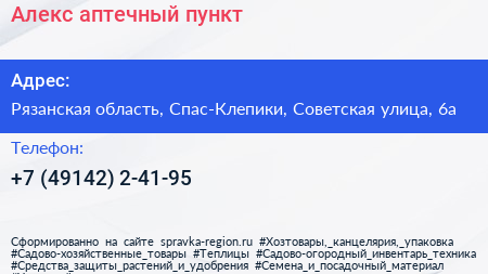 Алекс, аптечный пункт по адресу Рязанская область, Спас-Клепики, Советская улица, 6а в дальнейшем Организация, размещена в следующих категориях: