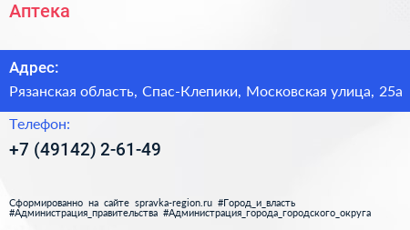 Аптека по адресу Рязанская область, Спас-Клепики, Московская улица, 25а в дальнейшем Организация, размещена в следующих категориях: