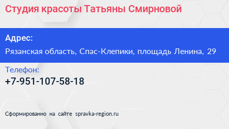 Студия красоты Татьяны Смирновой по адресу Рязанская область, Спас-Клепики, площадь Ленина, 29 в дальнейшем Организация, размещена в следующих категориях: