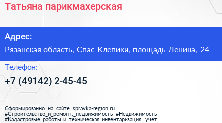 Татьяна, парикмахерская по адресу Рязанская область, Спас-Клепики, площадь Ленина, 24 в дальнейшем Организация, размещена в следующих категориях: