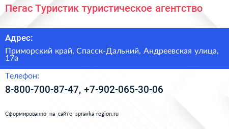 Пегас Туристик, туристическое агентство по адресу Приморский край, Спасск-Дальний, Андреевская улица, 17а в дальнейшем Организация, размещена в следующих категориях: