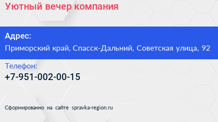 Уютный вечер, компания по адресу Приморский край, Спасск-Дальний, Советская улица, 92 в дальнейшем Организация, размещена в следующих категориях:
