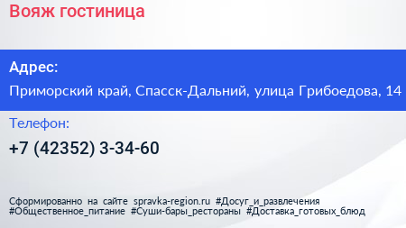 Вояж, гостиница по адресу Приморский край, Спасск-Дальний, улица Грибоедова, 14 в дальнейшем Организация, размещена в следующих категориях: