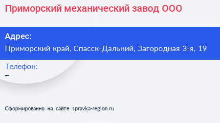 Приморский механический завод, ООО по адресу Приморский край, Спасск-Дальний, Загородная 3-я, 19 в дальнейшем Организация, размещена в следующих категориях: