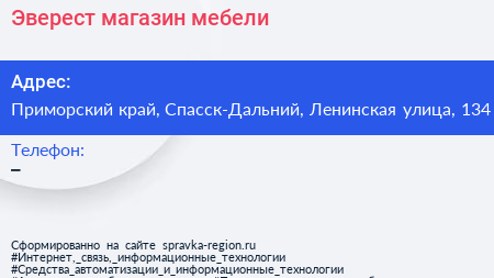 Эверест, магазин мебели по адресу Приморский край, Спасск-Дальний, Ленинская улица, 134 в дальнейшем Организация, размещена в следующих категориях: