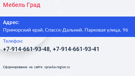 Мебель Град по адресу Приморский край, Спасск-Дальний, Парковая улица, 96 в дальнейшем Организация, размещена в следующих категориях: