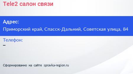 Tele2, салон связи по адресу Приморский край, Спасск-Дальний, Советская улица, 84 в дальнейшем Организация, размещена в следующих категориях: