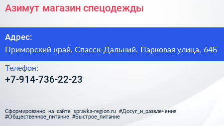 Азимут, магазин спецодежды по адресу Приморский край, Спасск-Дальний, Парковая улица, 64Б в дальнейшем Организация, размещена в следующих категориях: