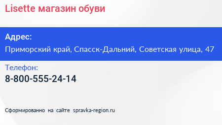 Lisette, магазин обуви по адресу Приморский край, Спасск-Дальний, Советская улица, 47 в дальнейшем Организация, размещена в следующих категориях: