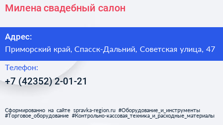 Милена, свадебный салон по адресу Приморский край, Спасск-Дальний, Советская улица, 47 в дальнейшем Организация, размещена в следующих категориях: